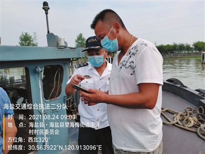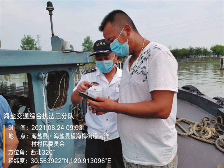 马师傅是江苏籍船户,来办事大厅办理一些船舶手续。他告诉工作人员,平时从南京到海盐做钢材运输生意,每天都会收到水上交通指挥平台发来的一些防疫提醒短信。马师傅夫妻俩都靠船运为生,这段时间,他们船上也配备了相应的口罩、消毒水等防疫物资。“基本都不上岸,在船上安全。停靠在码头时,还会遇到工作人员给我们测量体温,检查健康码。”马师傅说。